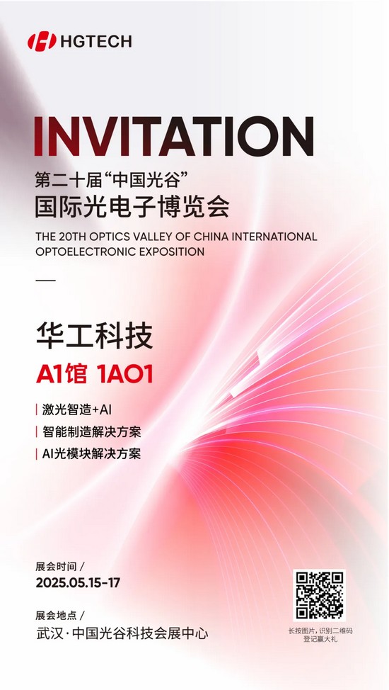 The 20th "China Optics Valley" International Optoelectronics Expo will be held at the China Optics Valley Science and Technology Convention and Exhibition Center from May 15th to 17th. HGTech will showcase its laser intelligent manufacturing + AI equipment, intelligent manufacturing solutions, and AI optical module solutions at the expo.